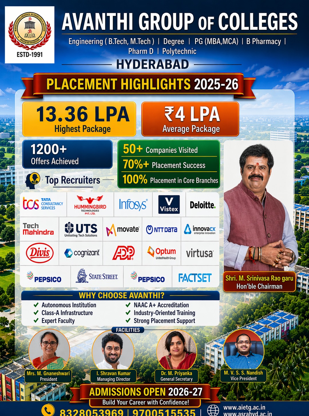 As a Top MBA College in Hyderabad, the institution emphasizes skill development through internships, workshops, and industry collaborations that enhance career readiness. With strong placement support and student-focused training programs, Avanthi Institute of Engineering and Technology ensures graduates are well-prepared to achieve academic excellence and long-term professional success.